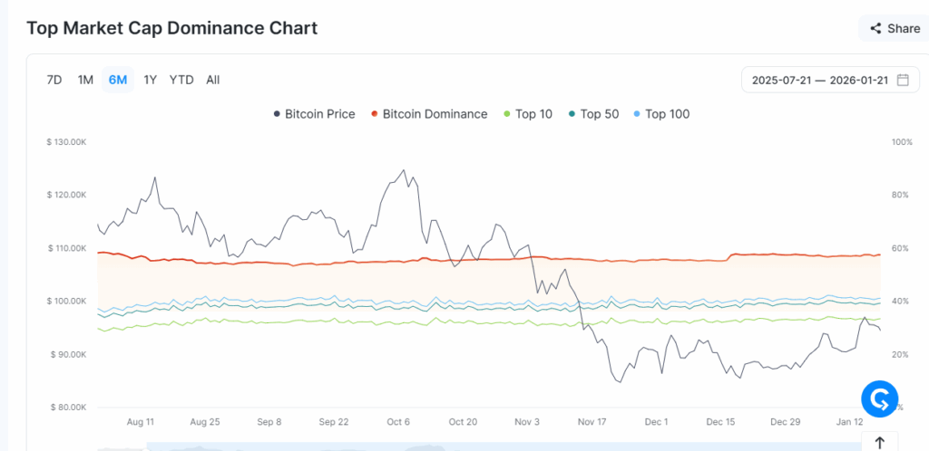 比特币主导地位坚守58%支撑,表明资金持续偏好BTC