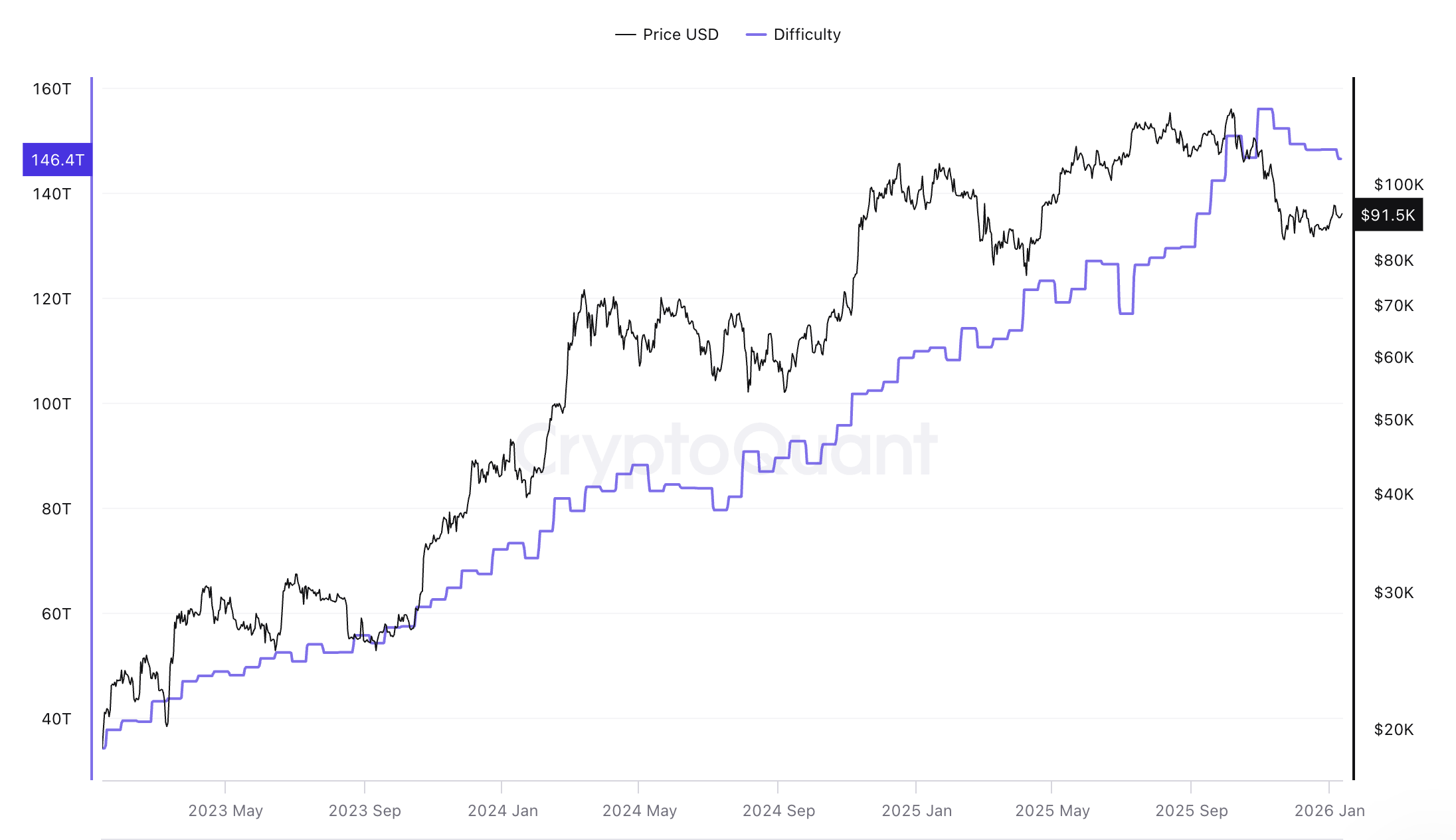 但CoinWarz数据显示,这种缓解可能只是暂时的。若当前条件持续,预计在2026年1月22日的下一次难度调整中,数值可能回升至148.2万亿。