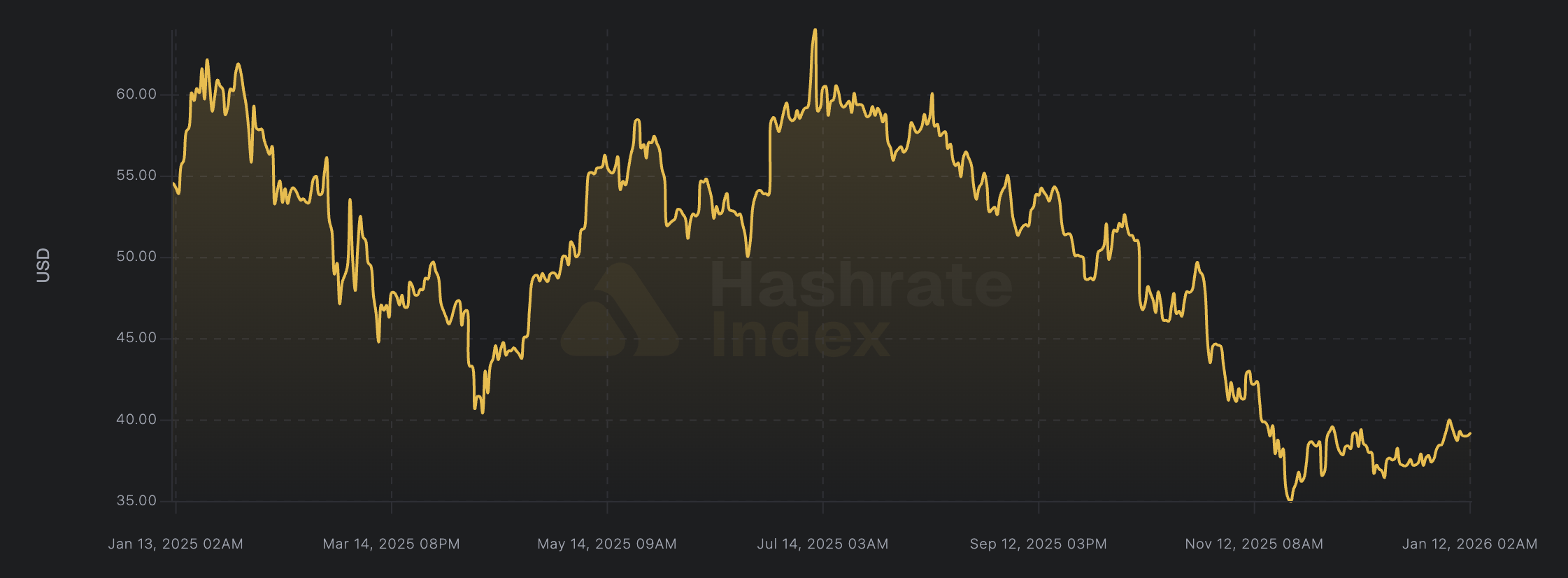 衡量单位算力预期收益的关键盈利指标“哈希价格”于11月跌破盈亏平衡线。当每日每PH/s收益降至约35美元时,众多运营商被迫重新评估矿机利用率和运营策略。