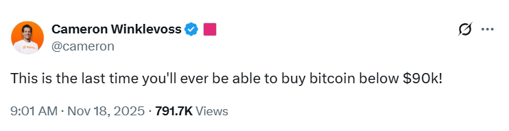 不过市场观点仍存分歧。Gemini联合创始人Cameron Winklevoss在X平台宣称:"这将是你们最后一次能以低于9万美元的价格购入比特币!"这反映出部分专家将近期下跌视为折扣买入良机。虽然如此,市场波动加剧之际,投资者仍需保持谨慎。