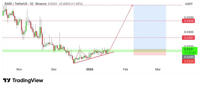 RARE现已确认突破日线整理区间,价格在沿上升趋势线保持支撑的同时成功站上阻力位。此次突破反映压缩后的自然扩张,而非应激性冲高。日线收盘显示价格已有效突破前阻力区。