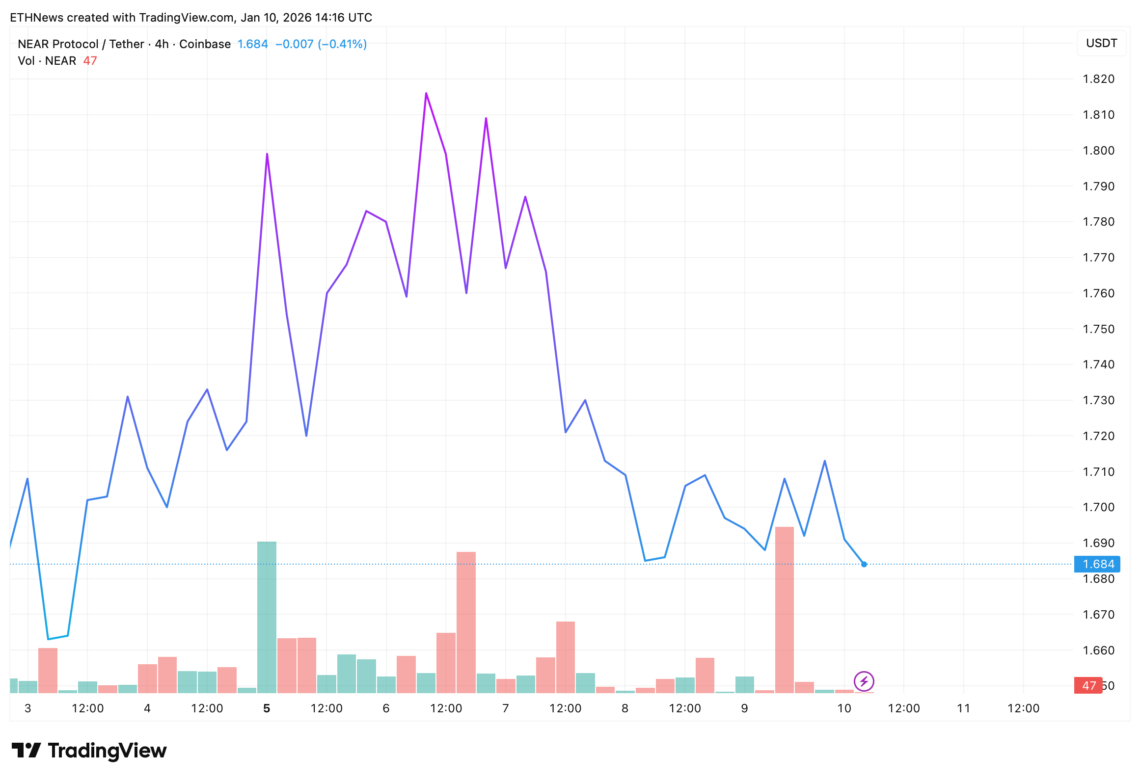 最新交易图表显示,NEAR在创下去年10月10日与11月23日以来的最低估值后,通过一系列波动形成更高低点,目前交易于1.68-1.70美元区间。这种底部形态表明卖压已减弱,买家正逐步入场。
