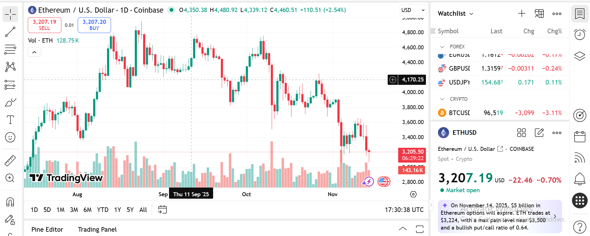 以太坊当前价格为3,207美元,市值达3,890亿美元,24小时交易量超过540亿美元。资金流向数据显示,过去一周以太坊相关ETF资金净流出累计超11亿美元。