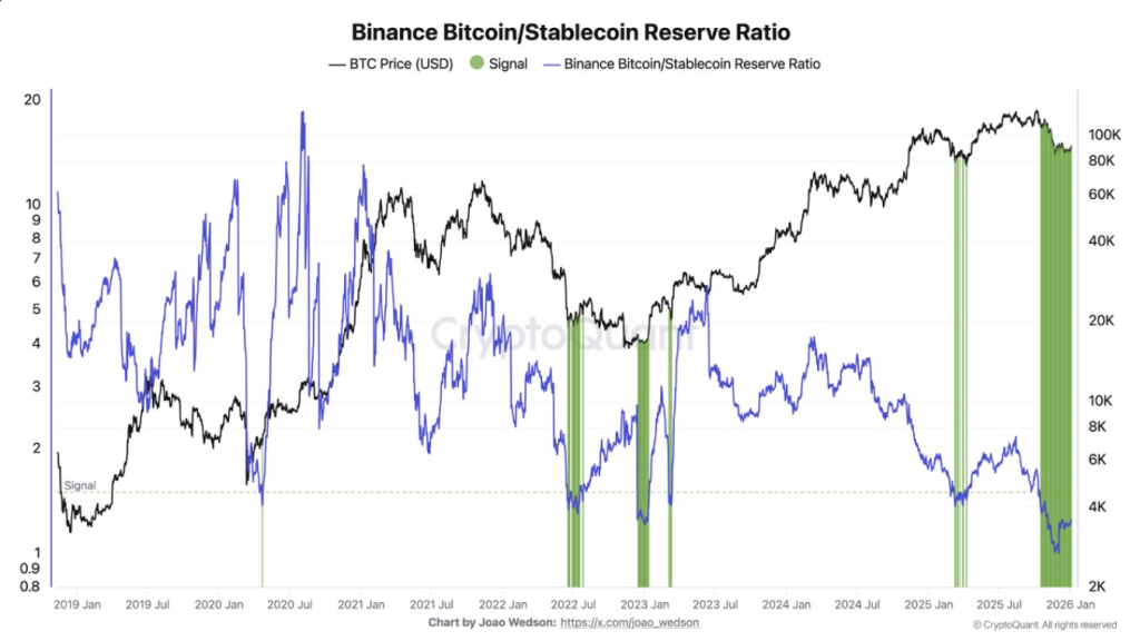 与此同时,链上数据显示比特币呈现积极趋势。币安的比特币/稳定币比率已开始上升,表明更多资本正从稳定币部署到比特币中。这暗示观望的流动性可能正在进入市场,可能进一步助推比特币的上行动能。