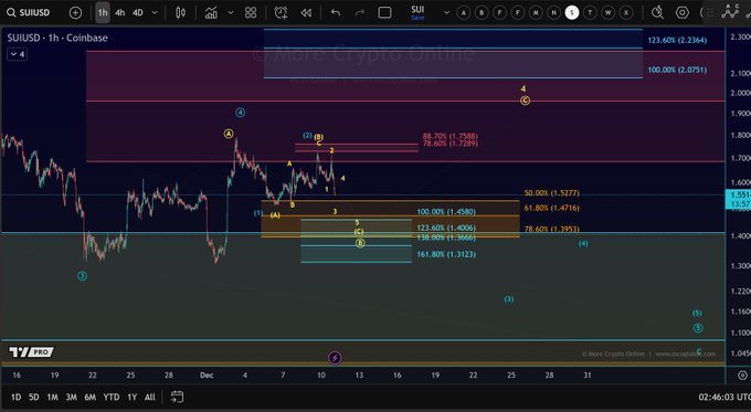 截至撰稿时,Sui 交易价格为 1.55 美元,日内跌幅 5.25%。日内形态呈现急涨急跌后滑向支撑的特征。尽管出现回调,10.6 亿美元的交易量仍显示出持续的市场参与度,使得当前波浪计数在技术上保持有效。