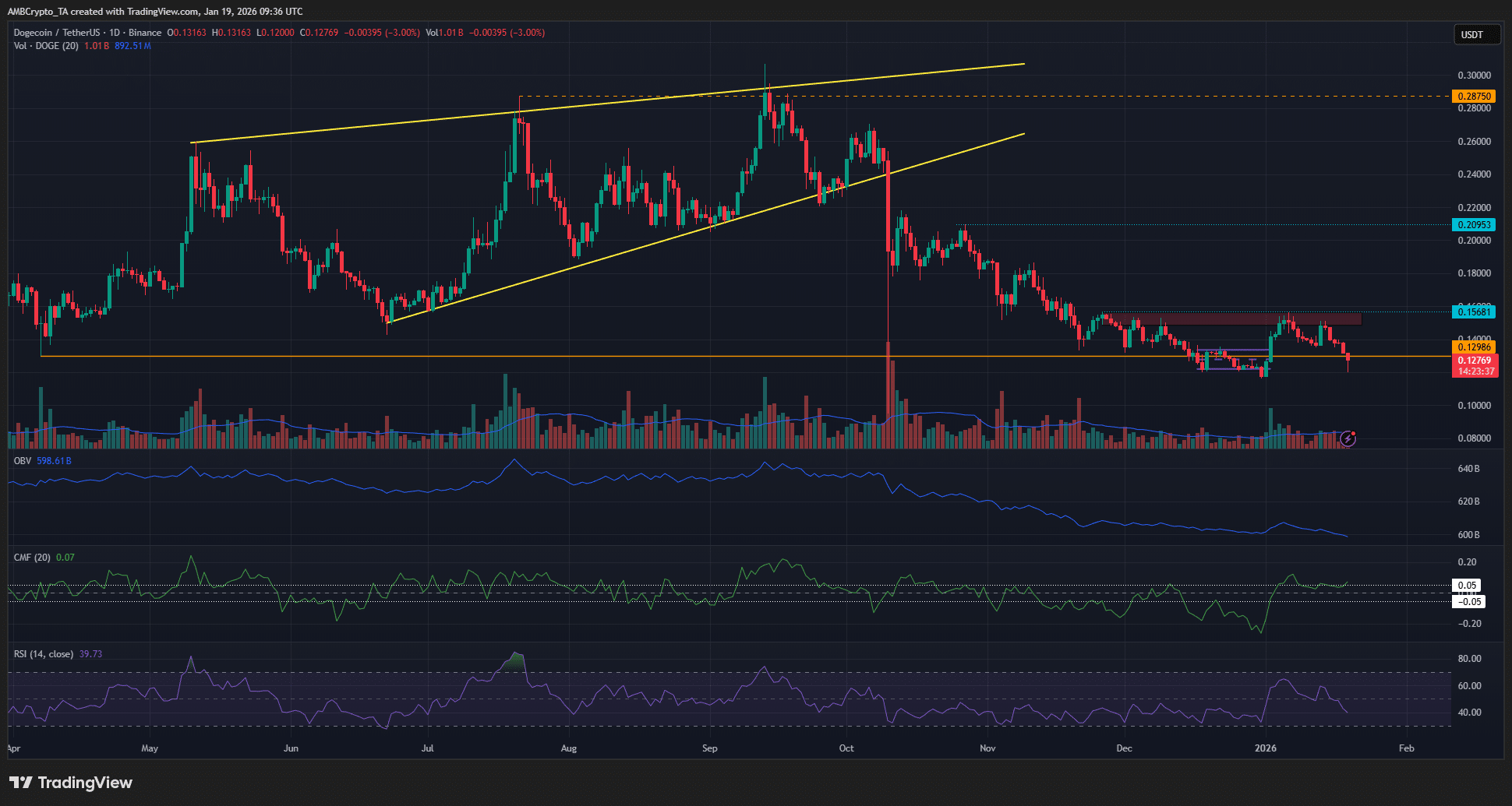 1月20日,狗狗币价格约为0.12美元。本月早些时候,该代币未能维持向0.15美元的推动。