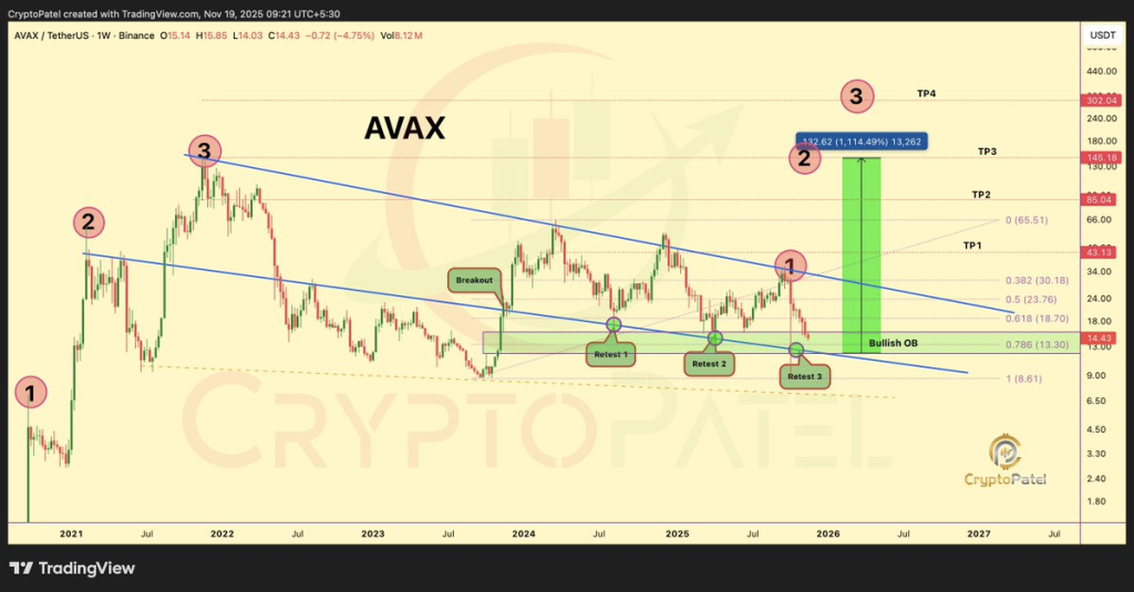 自2021年创下峰值以来,AVAX持续承压。截至撰稿时,其价格约为14.47美元,24小时交易量超过4.08亿美元。15-11美元之间的支撑区间因多重技术指标叠加而备受关注,包括四年期宏观支撑位、0.786斐波那契回撤位以及楔形底部支撑。