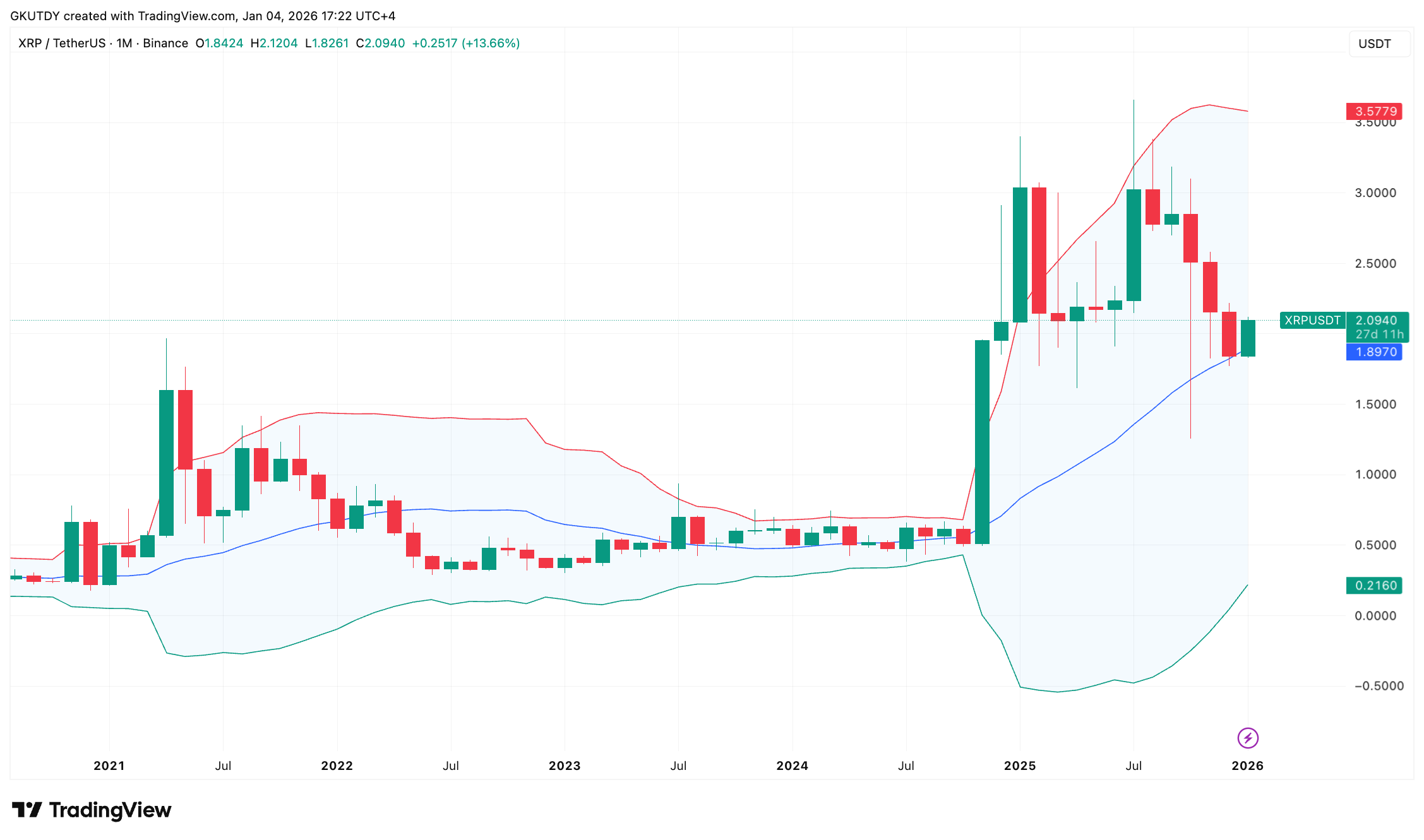 XRP在币安的交易价格接近2.11美元,月线布林带清晰展示了2026年的走势前景——这一画面无需过度解读已足够明朗。TradingView图表显示上轨阻力位接近3.58美元,这也解释了“75%涨幅看向3.5美元”这一标题的合理性。该数值仅是图表当前阻力位的整数近似值,略低于实际上轨。
