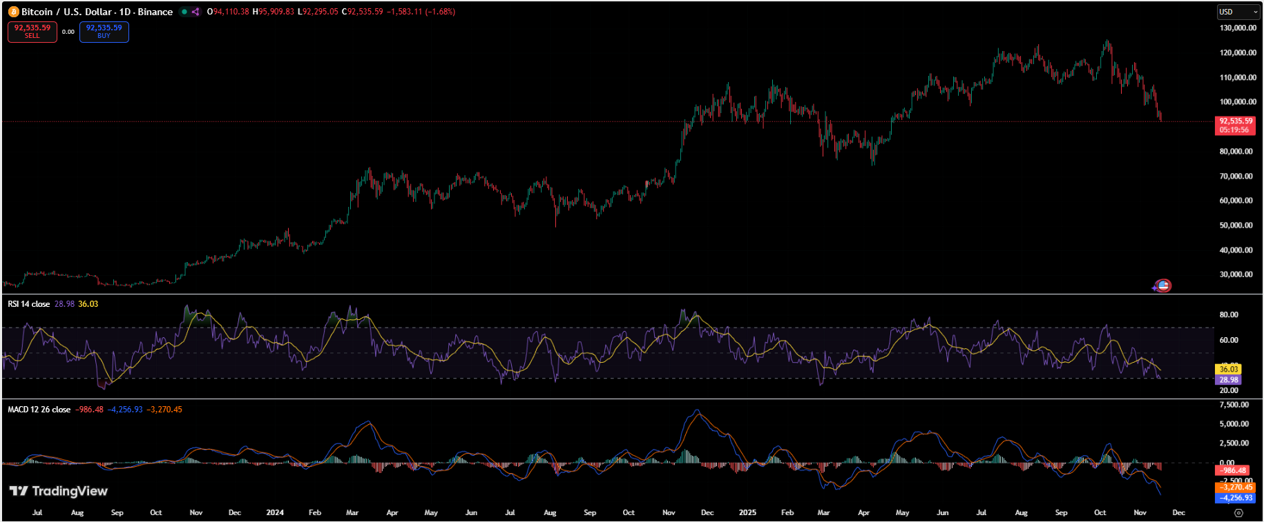 比特币失守9.3万美元关键支撑位,引发恐慌性抛售潮。多项技术指标转熊,包括超级趋势线、相对强弱指数(RSI)和MACD。机构资金外流加剧,贝莱德据称通过其ETF抛售比特币。