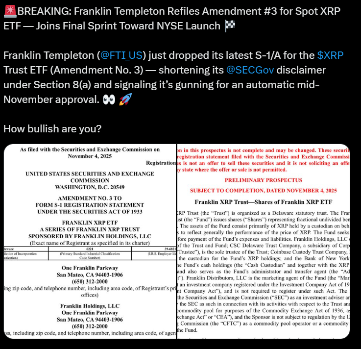 除400亿估值带来的热度外,ETF前景为XRP注入新动能。富兰克林邓普顿本周再次提交XRP ETF申请修正案,