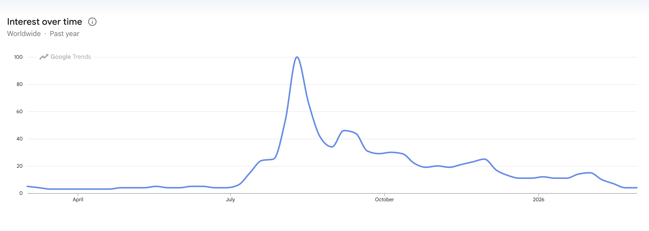 与此同时,加密市场情绪分析平台Santiment数据显示,山寨币在社交媒体上的提及量已降至两年低点。根据Google Trends统计,“山寨币”全球搜索量也降至年度低谷(100分制中的4分)。