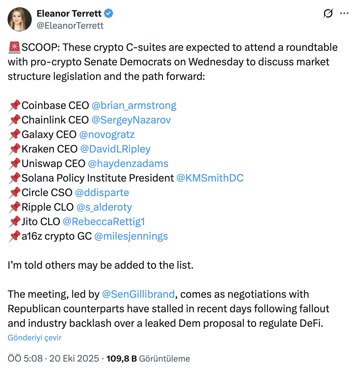 据福克斯商业频道记者埃莉诺·特雷特10月20日发布的推文显示,Coinbase首席执行官布莱恩·阿姆斯特朗、Chainlink创始人谢尔盖·纳扎罗夫、Galaxy创始人迈克·诺沃格拉茨等业界领袖将出席此次会议。包括Solana政策研究所所长克里斯汀·史密斯、Ripple法务总监斯图尔特·阿尔德罗蒂以及Circle首席战略官丹特·迪斯帕特在内的政策制定者也将参与,凸显此次会晤的重要性。