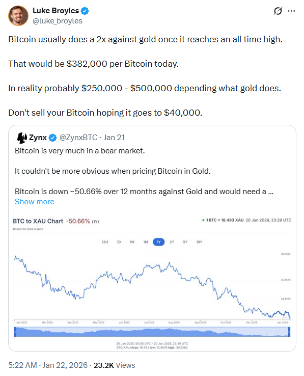 布罗伊尔斯在回应中提出,当比特币创下历史新高时,其价格通常相对于黄金上涨两倍。根据他的计算,按当前金价,从近期基数上涨两倍意味着BTC价格约为38.2万美元。更现实地说,这位比特币支持者指出,根据金价走势,其价格可能在25万至50万美元之间。