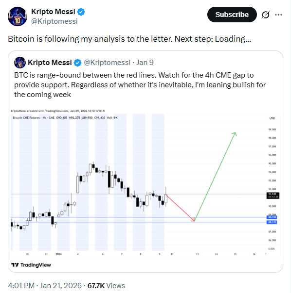 另一位加密货币分析师Kripto Messi也在X平台上对比特币美元价格提出了看涨预测。他表示,BTC近期的价格走势完全符合其1月9日的分析和图表预期。