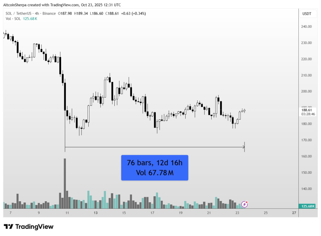 从4小时图观察,$SOL在170美元形成坚实底部后,目前于180-190美元区间整固——该支撑位在过去12天内历经多次考验。这个积累了约12天16小时的盘整区间,伴随6778万的成交量,显示出市场参与度扎实。