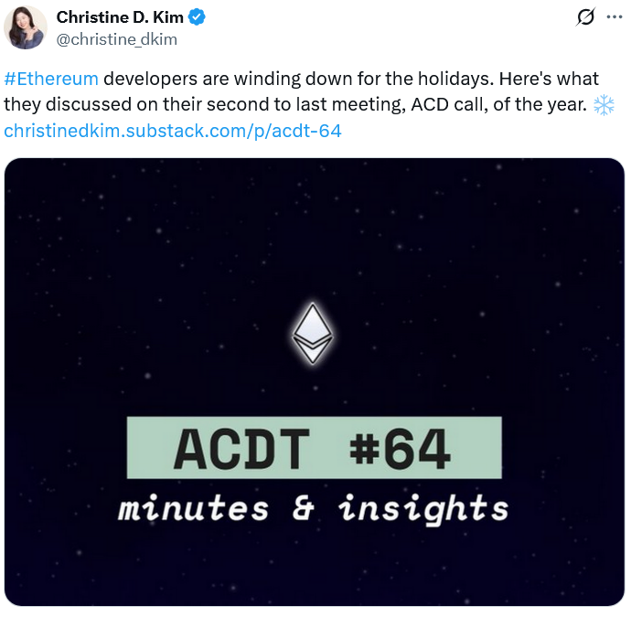 以太坊网络交易吞吐量将于下月迎来新一轮提升,开发人员计划在1月将Gas上限从6000万增至8000万。银河数码研究团队副总裁Christine Kim在周一的核心开发者会议纪要中透露,Nethermind代表指出开发人员应在1月7日下次BPO硬分叉后做好提高Gas上限的准备。