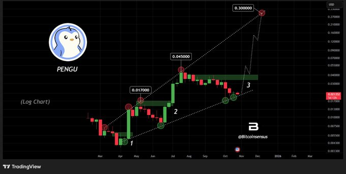 PENGU在周线对数图表中持续沿着既定上升通道运行,显示出多头延续的可能性。分析师发现其呈现规律的三浪模式,表明代币可能正处于强势上涨前的积累阶段。尽管存在短期波动,活跃的社区参与和文化品牌建设仍支撑着市场乐观情绪。