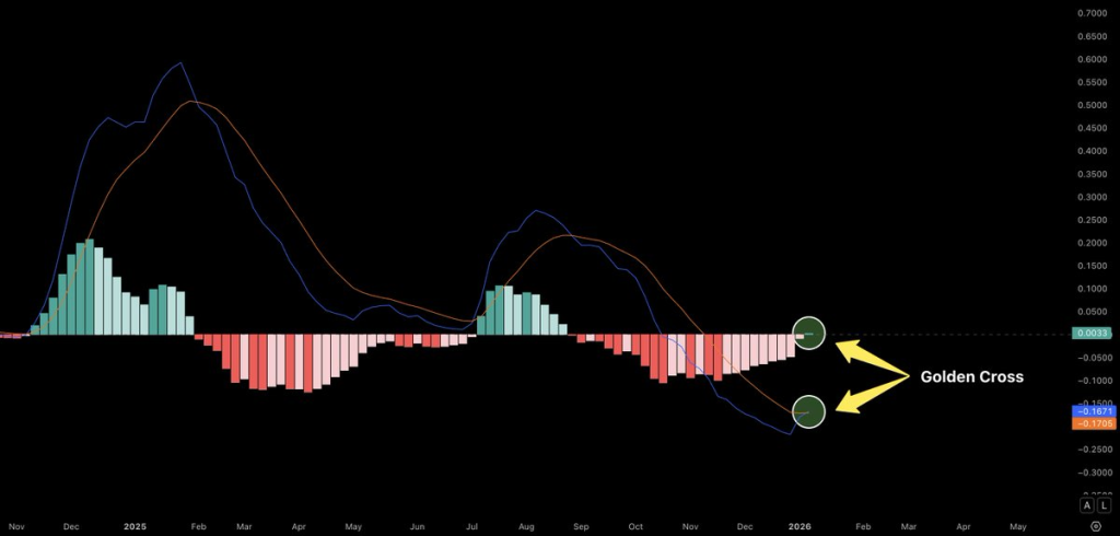 目前RSI位于46.77,而其均线位于43.24。回顾过往,周线时间框架上的前几次交叉出现后,均伴随着周线阳烛及持续的涨幅。类似的形态于2026年1月初再次出现,市场正密切关注其是否会产生相似反应。