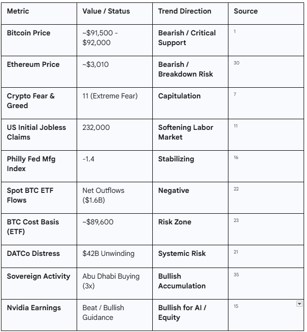 当前市场呈现典型投降特征,数字资产正在经历由DATCo去杠杆和ETF资金外逃驱动的暴力重定价。在政府停摆造成的数据真空背景下,AI"创世使命"暂时遮蔽了加密领域的《天才法案》。专业投资者需注意:比特币与纳斯达克短期脱钩仍将持续;89,600美元ETF成本线是观察散户抛压的关键阀值;恐惧指数11与MVRV重置意味着市场已数学低估;阿布扎比投资委员会等主权机构正在逆势增持。