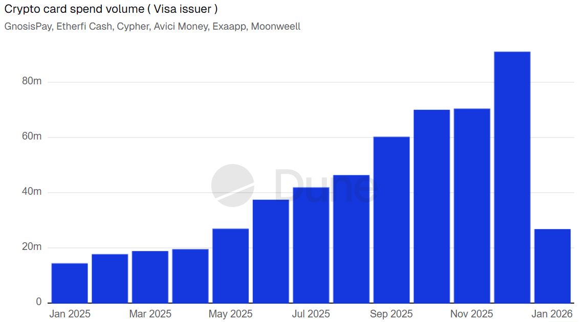 Visa的加密支付卡在2025年实现了惊人的飞跃,净支出从1月的1460万美元跃升至12月的9130万美元,增幅达525%。