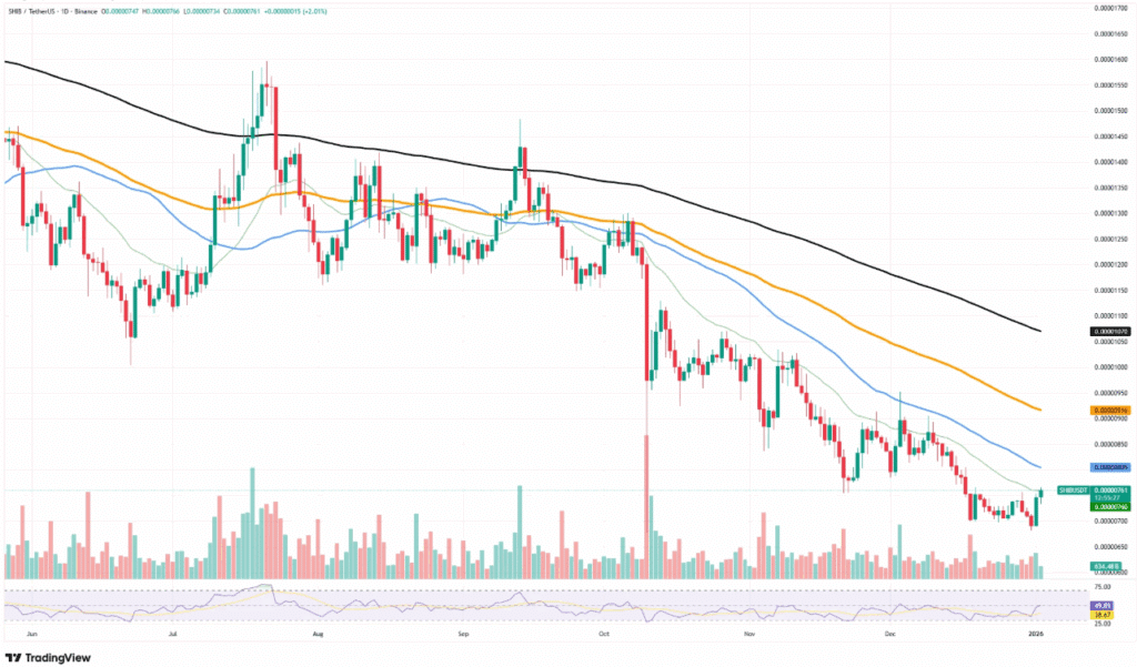 尽管出现这一动态,SHIB价格仍保持低迷。该资产持续交易于关键的指数移动平均线(特别是26日和50日均线)下方,这些均线正构成阻力位。当前市场行为显示低波动性和疲弱动能,表明短期内出现急剧突破的可能性较低。