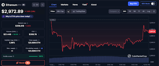 根据发稿时的CoinMarketCap数据,以太坊交易价格约为2,972美元,盘中出现显著波动,表现为快速下跌和间歇性反弹。ETH价格从3,000美元上方大幅下挫,进入较低的盘整区间。交易活动呈现反复震荡,特点是短暂上行后再度面临下行压力。