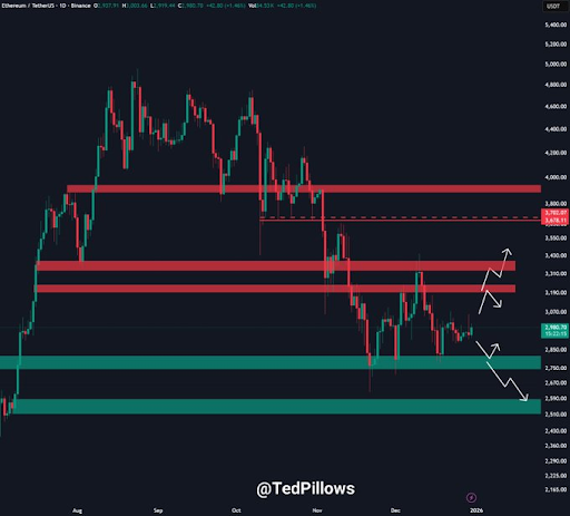 Ted Pillows的观察确认了当前价格趋势,并权衡了以太坊后续走势。据Ted分析,ETH价格维持在2,950-3,000美元区间,在关键支撑位和阻力位附近整理。分析显示3,000美元和3,100美元附近存在阻力,以太坊价格难以维持上涨动能。要实现看涨走势,以太坊价格需重新夺回3,000美元区域,此前的价格尝试也印证了这一点。