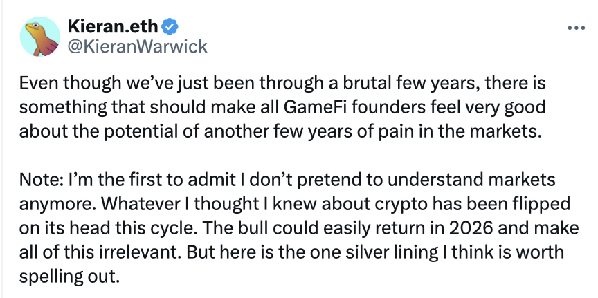 伊留尼姆创始人基兰·沃里克指出,优秀的加密游戏应该具备独立运营能力,而不必依赖强劲的加密市场。他在11月24日的推文中表示:"一款成功掩盖加密体验的游戏,完全有可能在不依赖加密投资者流动性的情况下创造惊人收益。"