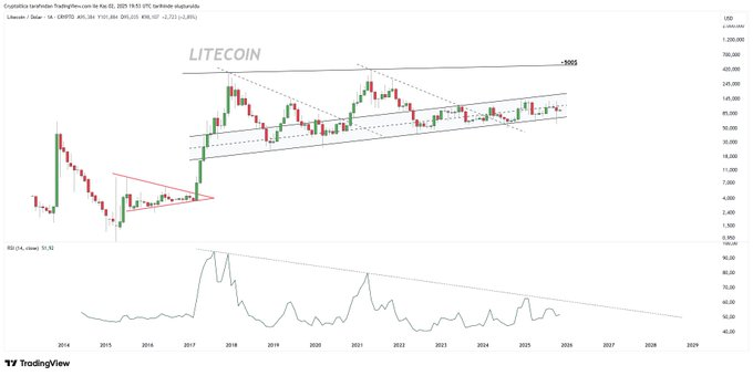 莱特币在50-60美元支撑位与300-305美元阻力位之间形成了稳定的长期积累模式。自2017年以来相对强弱指数(RSI)的持续压缩暗示,一旦市场波动趋于正常化,可能出现动能突破。社交媒体分析师情绪转向乐观,认为莱特币当前形态与XRP早前的看涨模式存在相似性。