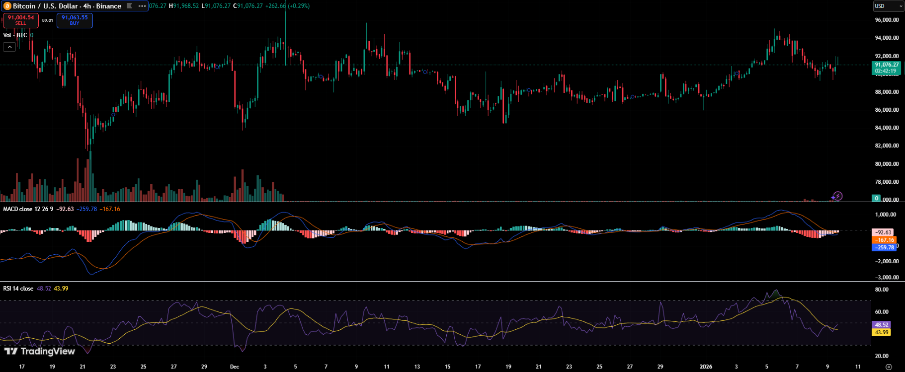 从动量角度来看,指标显示比特币正处于十字路口,而非明确的趋势中。在4小时图上,MACD近期已转负,信号线下穿MACD线,表明在近期高点附近遇阻后,短期看涨动能正在消退。然而,柱状图开始收缩,这通常意味着抛压正在减弱而非加速。这与市场处于盘整而非开启更深跌势的观点相符。
