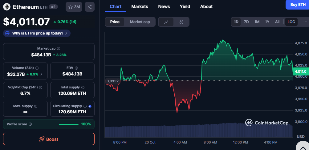 以太坊价格稳定在4011美元附近,交易区间维持在3950-3980美元支撑位与4070-4080美元阻力位之间,日内波动率约4%。24小时交易量达320亿美元,成交量/市值比率为6.7%,表明市场活跃有序且执行价差收窄。当前流通供应量约1.2069亿ETH,完全稀释估值与市值基本持平,市场焦点转向能否有效突破4080美元并上探4150美元中线。