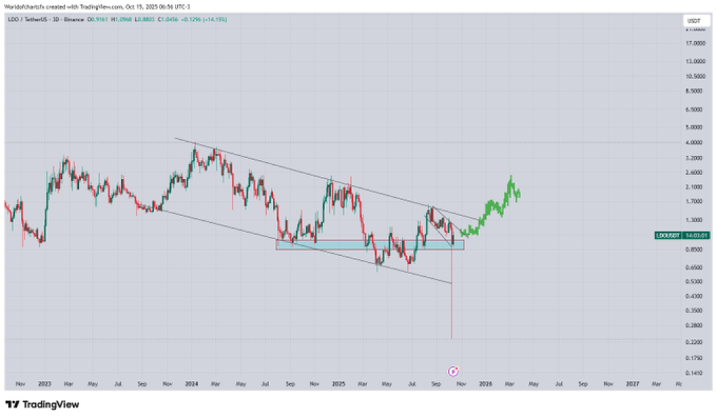 分析师World of Charts指出,LDO的图表结构仍具建设性。他强调只要代币能守住略低于1美元的水平支撑位,强劲反弹的概率依然很高。简言之,若价格不跌破该基线,Lido可能正在酝酿多数交易者当前忽视的重大反弹行情。