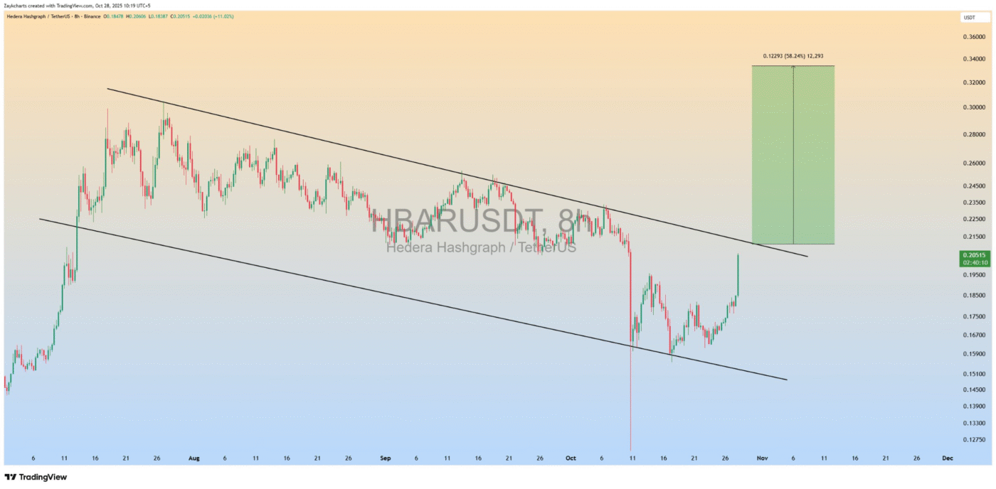 当Tapzi和Truth Predict吸引市场目光时,Hedera(HBAR)在山寨币市场持续掀起波澜。分析师ZAYKCharts指出,Hedera近期突破下降通道中线,预示潜在趋势反转。