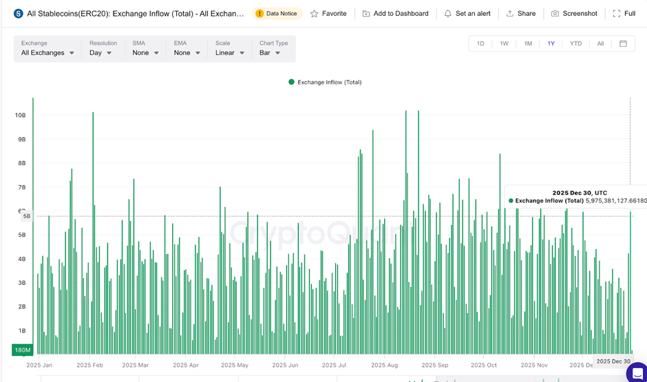 稳定币相当于加密世界的“现金”。当稳定币流入交易所,通常预示买家准备就绪;而当流入量下降,则意味着待入场的新增资金减少。