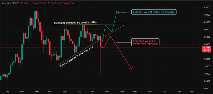 分析师Lark Davis(@TheCryptoLark)指出,资产下一步走势明确:若Sui能收复破位趋势线并重回上升三角,则看涨形态重启;反之将预示更大跌幅。当前2.80-2.90美元交易区间正位于该关键位下方,多头需重夺控制权才能扭转势头。