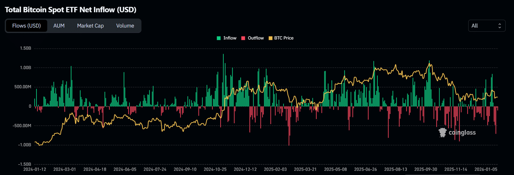 与此同时,美国现货比特币ETF在过去24小时内录得1.035亿美元净流出,标志着本周连续第五日资金外流。需求疲软源于本周宏观环境的不确定性——唐纳德·特朗普总统重新发出关税威胁,促使投资者转向黄金白银等避险资产,两者价格均已创历史新高。