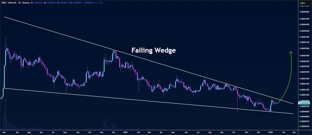 柴犬币在显现潜在增长迹象后,正逐步逼近0.00000800美元的关键位置。该加密货币在三日时间框架上正接近从下降楔形形态中突破。交易员与分析人士正密切关注价格动向,因为这可能意味着该资产在未来几日将出现显著跃升。