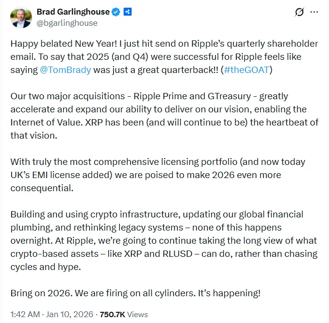 加林豪斯表示,2025年对瑞波而言是强劲的一年,尤其在最后一个季度。根据XRP相关新闻,他指出了其稳健增长而非短期获利。值得注意的是,他的发言重点在于结构、耐心与长期规划。他将瑞波实验室过去一年的表现比作不言自明、无需夸大的明确成果。