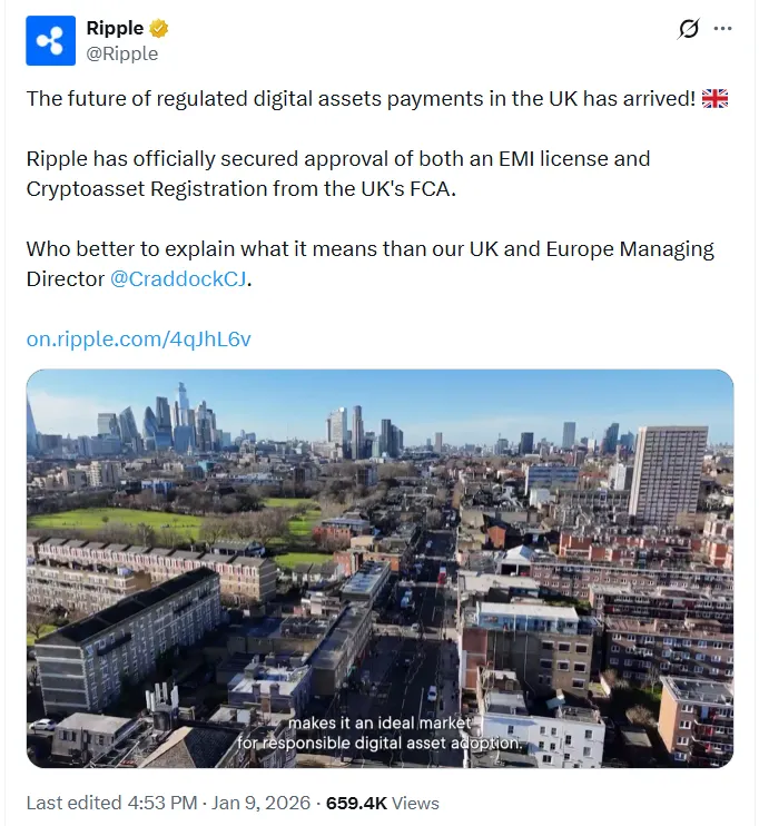 在另一则XRP新闻中,瑞波宣布了来自英国的重大更新。2026年1月9日,公司确认已获得英国金融行为监管局的批准。值得注意的是,这包括电子货币机构许可证和加密资产注册。