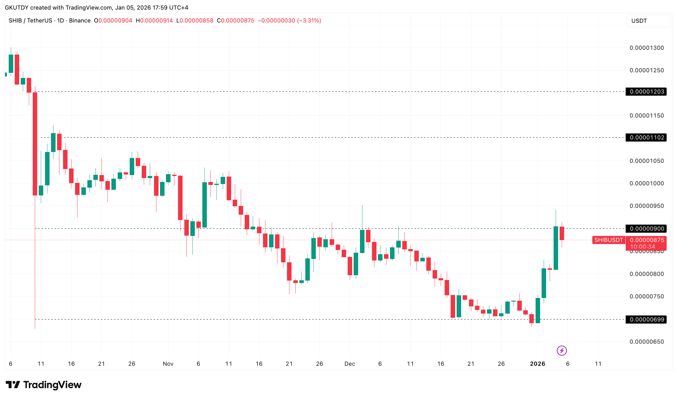 此番格局的特殊性在于市值连锁效应:若收盘价站稳0.0001101美元上方,将创出局部新高,推动柴犬币在CoinMarketCap全球加密资产排名中飙升七个位次,届时将一举超越海德拉、DAI、Canton、雪崩协议、莱特币、Ethena与SUI。