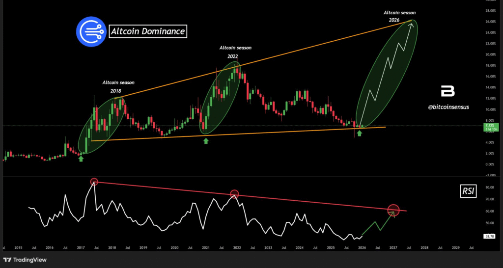 随着市场对此转变作出反应,图表分析预测山寨币可能在2026年前迎来大幅上涨。这场潜在的山寨币行情将以主导率上升和RSI走高为标志,并可能推动山寨币实现显著上涨。