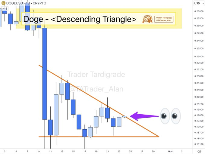 狗狗币日线图正在构筑下降三角形形态,分析师Trader Tardigrade(@TATrader_Alan)指出,这种结构表现为价格在逐步降低的高点与水平支撑线之间持续压缩,反映买卖双方在关键位展开拉锯战。