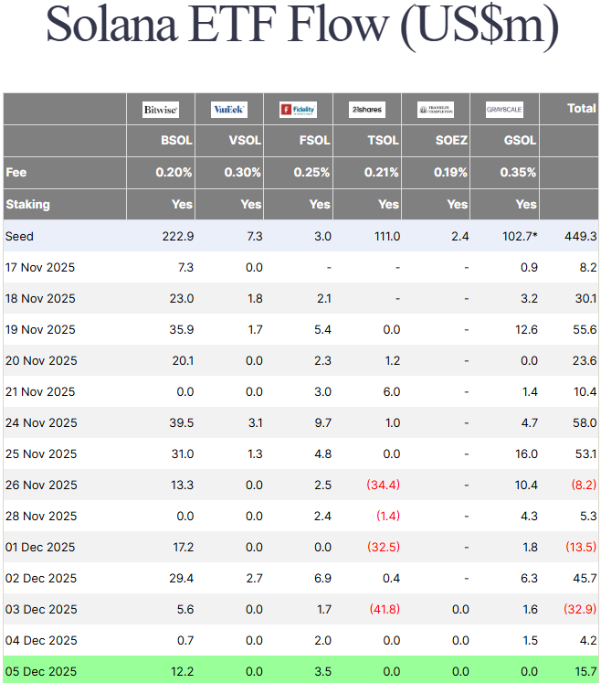 衍生品市场同样释放消极信号。CoinGlass数据显示,Solana期货未平仓合约下降约2.5%至71亿美元,表明交易者风险偏好减弱。值得注意的是,这种下滑发生在机构情绪向好的背景下——Farside Investors统计显示,12月5日美国现货Solana ETF单日流入1570万美元,其中Bitwise的BSOL贡献最大单笔流入1220万美元。
