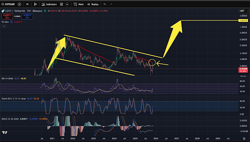 近期市场波动使Coti价格接近关键区域,该位置曾多次引发买方介入。当前技术形态虽显现早期复苏信号,但在更高时间框架内整体趋势仍保持谨慎。