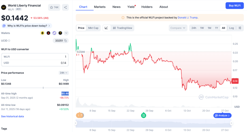 WLFI代币当前交易价约0.14美元,过去24小时微跌0.5%。相比9月初0.46美元的高点仍下跌近70%,反映出加密市场的典型波动性。