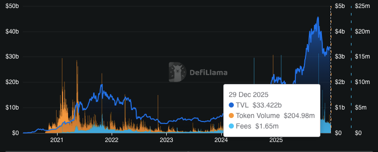 与此同时,DeFi领域近几个月出现显著增长。截至目前,DeFi平台总锁仓量达到334亿美元,较往年大幅跃升。这一激增也反映在持续增长的代币交易量上,目前已达到2.0498亿美元,同时DeFi平台产生的费用达到16.5亿美元。DeFi的增长为AAVE和其他DeFi代币提供了有利环境。