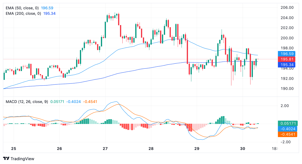 根据4小时TradingView图表显示,Solana现报价195.81美元,介于50日均线(196.59美元)与200日均线(195.34美元)之间。这种均线收敛形态预示着潜在突破区域的形成,尤其当短期均线即将上穿长期均线时,通常被交易员视为看涨延续信号。
