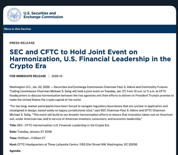 今日的加密新闻无关价格波动,而关乎监管领域。2026年1月27日,美国两大监管机构将共同商讨加密市场议题。会议将于东部时间上午10点至11点在华盛顿特区的CFTC总部举行。