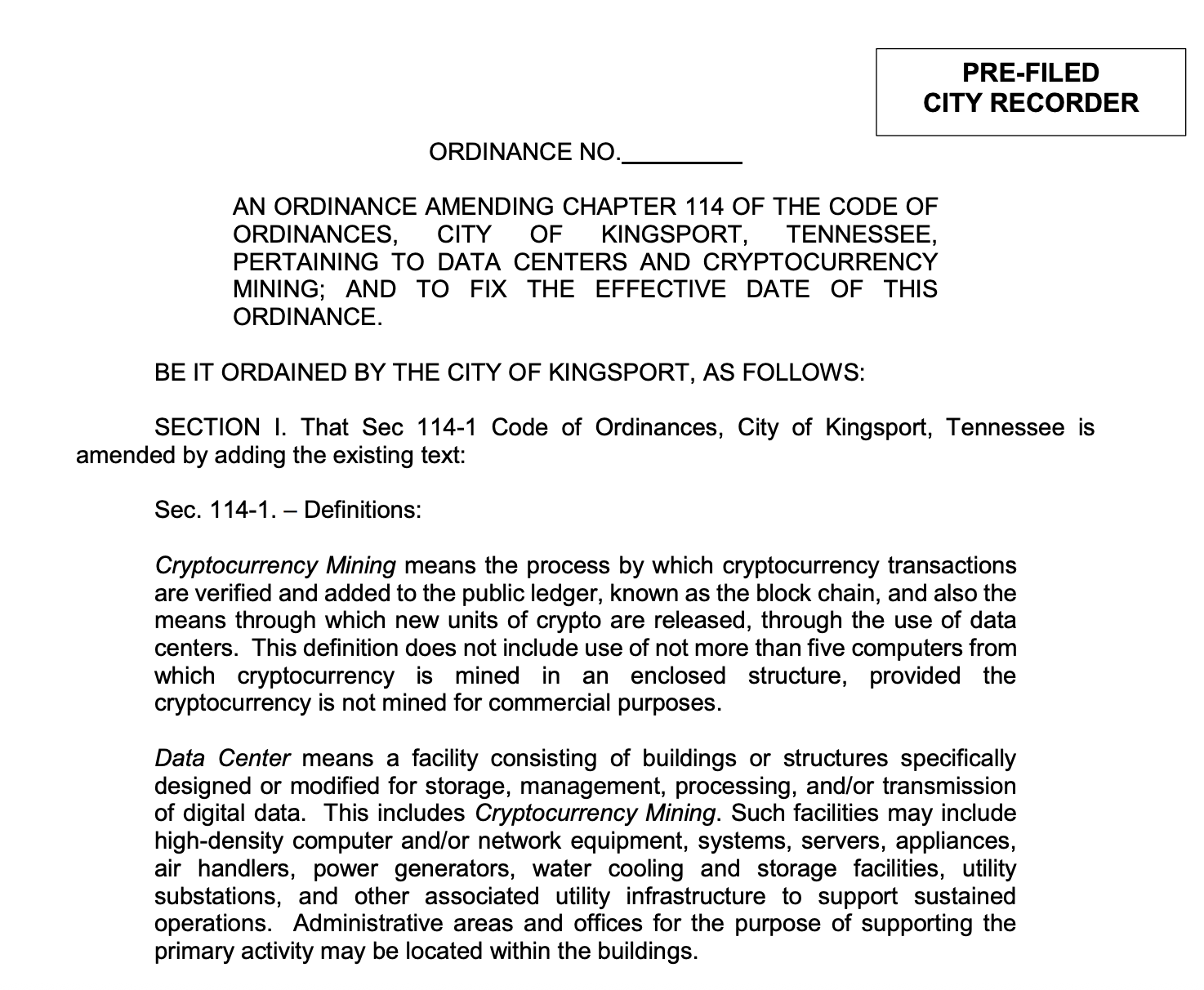 田纳西州金斯波特市议会批准分区法规修订,为加密货币挖矿公司与数据中心本地化运营铺平道路