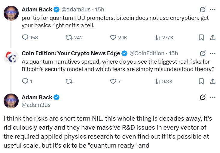 比特币基础设施公司Blockstream联合创始人、密码朋克亚当·巴克周四通过系列推文指出,让比特币做好"量子准备"是好事,但未来几十年这都不会构成威胁,因为该技术仍处于"极其早期阶段",且存在研发难题。他预测未来十年不会出现风险,即使比特币部分加密被破解,其核心安全模型并不依赖加密技术,"不会导致网络上的比特币被盗"。